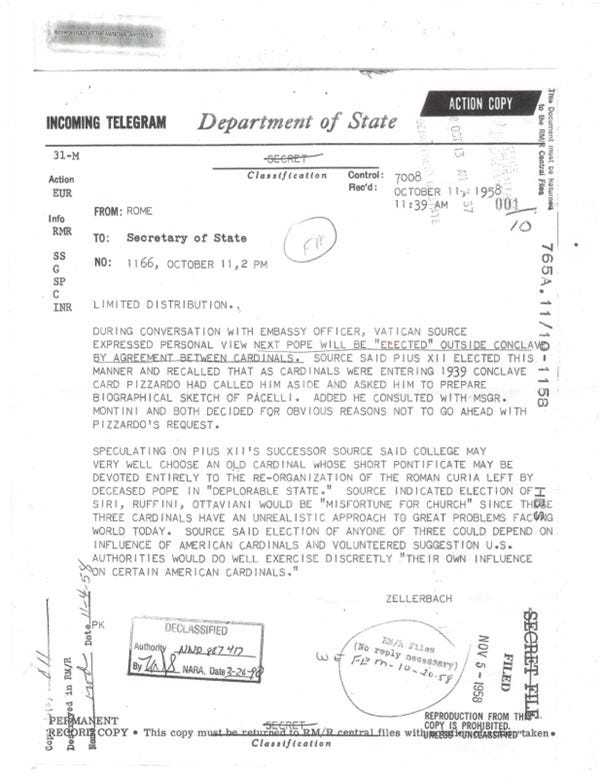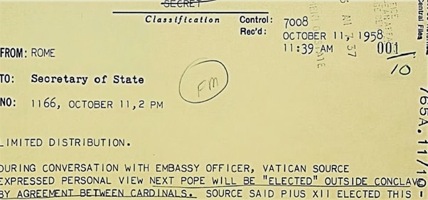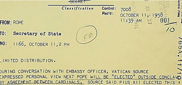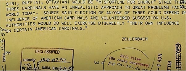 Declassified US Documents Prove that the American Government conspired to prevent Traditional Cardinals, including Cardinal Siri and Ottaviani from becoming Pope in 1958!
